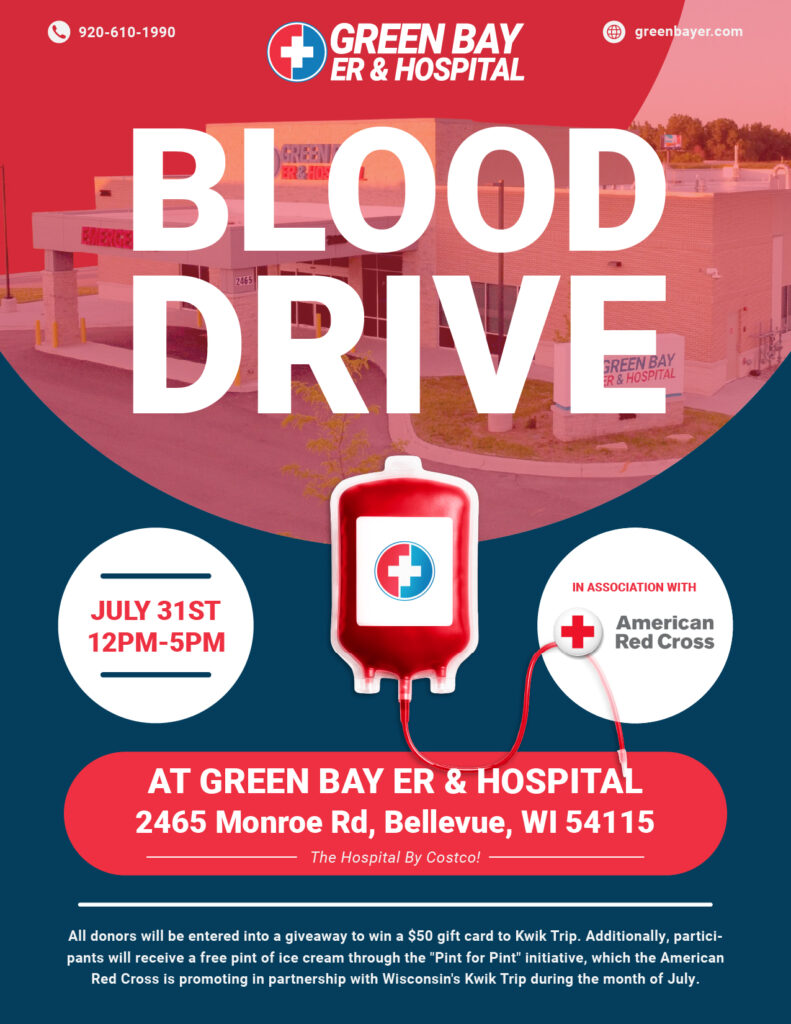 Join Green Bay ER & Hospital for a Blood Drive on July 31st from 12 p.m. to 5 p.m.